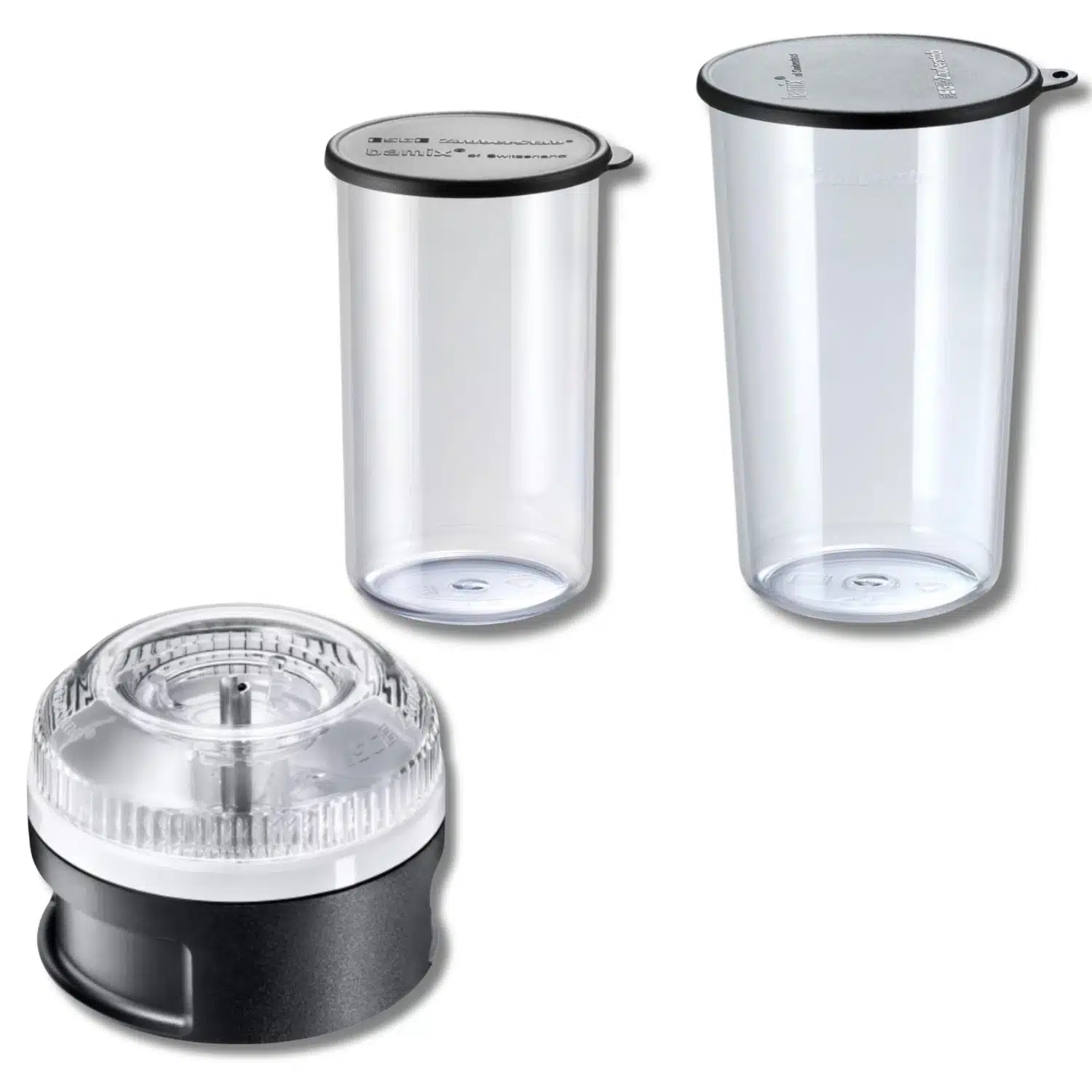 De processormaalbak is ideaal voor taken waarbij je fijne structuur nodig hebt. Hij maalt harde ingrediënten zoals noten en kaas, maar ook chocolade of ijsblokjes. Vloeibare bereidingen zoals pesto of babyvoeding gaan er net zo makkelijk doorheen. De mengbekers van 400 en 600 ml hebben een fijne vorm waardoor mixen met de Bamix soepel en precies gaat.