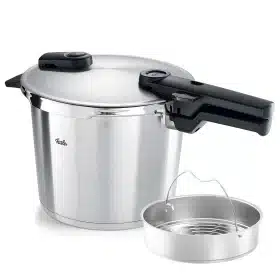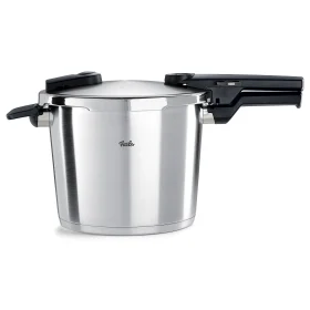 De Fissler VitaQuick Premium snelkookpan is een robuuste en praktische pan voor wie efficiënt en veilig wil koken. De pan is vervaardigd uit duurzaam roestvrij staal en voorzien van stevige kunststof grepen die prettig in de hand liggen. Dankzij het doordachte ontwerp met een duidelijke inhoudsaanduiding aan de binnenzijde en een afneembaar handvat is de pan eenvoudig in gebruik. De snelkookpan beschikt bovendien over een handig stoplichtsysteem dat aangeeft wanneer je de warmtebron moet bijstellen en een slotaanduiding die laat zien of de pan goed is gesloten.