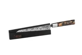 Het Kiritsuke mes combineert de functionaliteit van een santoku en koksmes en de ongeëvenaarde schepte zorgt voor een ongekende precisie bij elke snede. Het mes is hand gesmeed in maar liefst 67 lagen van AUS10 staal en heeft een hardheid van 61 Rockwell. Dit resulteert in een zeer prettige snijervaring en langdurige scherpte.