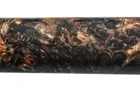 Het mes heeft een elegant ontwerp met een wortelhouten heft i.c.m. resin wat zorgt voor duurzaamheid. Het prachtige patroon op het lemmet komt voort uit 67 lagen staal waarin een speciale zwarte stof zit verwerkt, waardoor de belijning van de lagen staal extra worden geaccentueerd.
