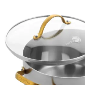 Hoogwaardig 3-laags roestvrij staal (55% gerecycled roestvrij staal) zorgt voor een gelijkmatige warmteverdeling, nauwkeurige controle, perfect bruinen, schroeien, braden, blussen en nog veel meer. Met de grepen in goudkleurig heeft dit een erg chique uitstraling