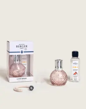 De Lampe Berger Giftset Disco Rose valt op door zijn ronde vorm en het damier-patroon in glas, afgewerkt in een zachte roze tint.